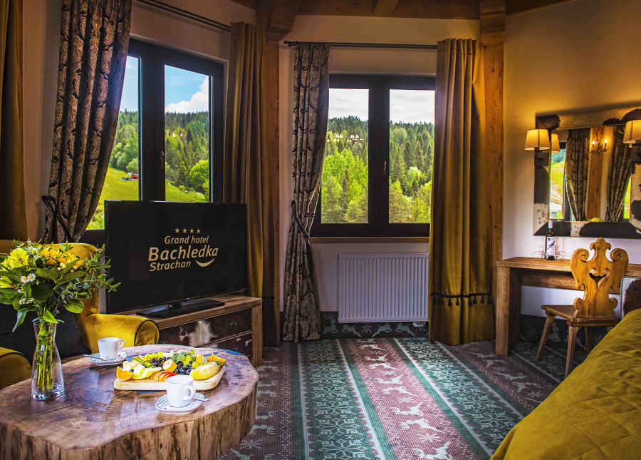 The luxurious Grand Apartment "Hohenlohe" is located on the highest 5th floor of the hotel and has a balcony with exclusive views of the Belianske Tatras, the sunrise, or the slopes of the Ski Center Bachledka.